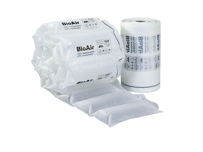 BioAir 全生物降解氣泡枕(Filler)BioAir (Compostable Air Pillow)是由全生物降解材料(PBAT)通過吹膜設備和制袋設備制成的氣囊狀薄膜產(chǎn)品。使用時經(jīng)過充氣設備充氣熱封后,用于包裝容器內(nèi)產(chǎn)品的填充、減震、穩(wěn)固產(chǎn)品,可有效吸收貨物運輸過程中因晃動、震動、碰撞、拋丟所帶來的沖擊力,起到緩沖保護的作用,確保產(chǎn)品運輸安全。同時在自然環(huán)境中分裂降解為二氧化碳和水,一款環(huán)保可降解的緩沖保護包裝材料。